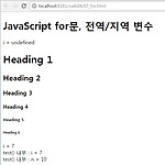 - JavaScript의 전역 변수(global variable): 태그 안에서 선언된 변수 선언된 위치와 상관 없이 변수 선언부분을 script의 첫부분으로 이동 - JavaScript의 지역 변수(local variable): 함수(function) 내부에서 선언된 변수 - 자바문법과 동일 12345678910111213141516171819202122232425262728293031323334353637383940JavaScriptJavaScript for문, 전역/지역 변수 var output = document.getElementById('output'); output.innerHTML += 'i = ' + i + ' '; //var x = 10;//var x = 123; for(var i = ..